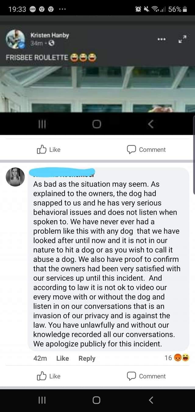 Mckenzie says: “I feel it incredibly important that this video be shared far and wide! This is a couple in Hermanus who are “well-known house sitters”. The video of them abusing this dog is absolutely horrifying and I hope they land up paying the price for this cruelty. The dog in the video belongs to a woman named Mel Colton from Hermanus and she has shared the video on the Hermanus community group but the group is private so I’m sharing it publicly here.”