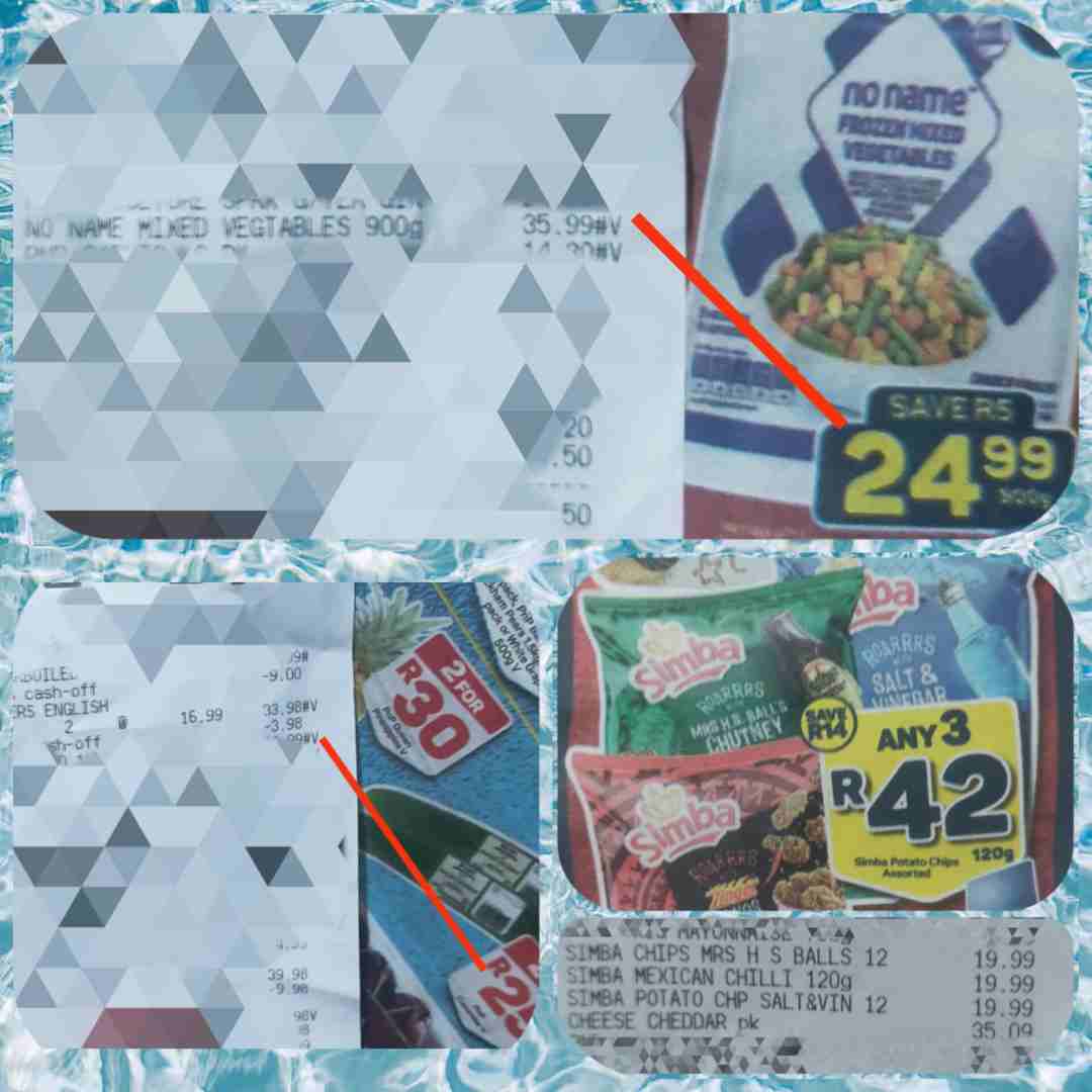 Another customer paid R35.99 for 900g of NoName Mixed Frozen Vegetables, despite the ad saying it should be R24.99 and the price label on the shelf stating R29.99 when the advertisement touted “Save R5”. This was a difference of R11 and the customer did not get the advertised savings of R4.99.