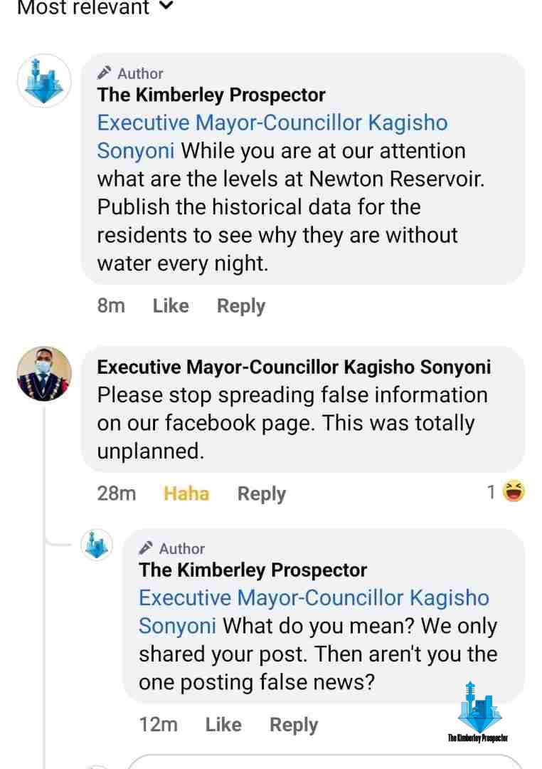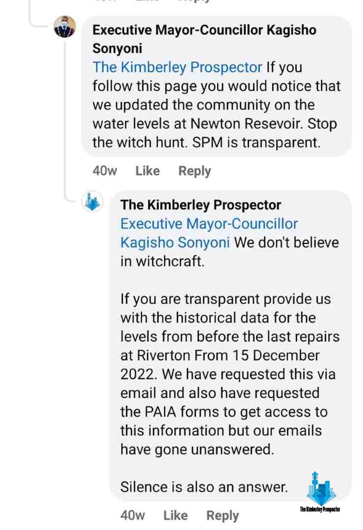 The newspaper points to the fact that past municipal spokespersons have not responded to media inquiries from the Kimberley Prospector for years and that the municipality has generally ignored or deflected media inquiries and questions, even when questioned on social media. Instead of giving straight-up answers Mayor Kagisho Sonyoni accused the newspaper of being on a witch hunt, but he has never responded to our important questions on social media.
