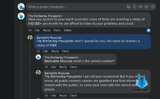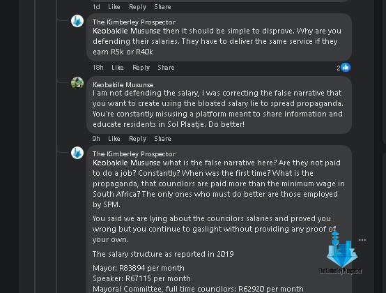 The Kimberley Prospector then cited a 2019 salary structure published in the Diamond Field Advertiser on 1 March 2019, which showed that full-time councillors were earning R62 920 per month. Musunse responded that the community newspaper was lying, had an agenda, and was spreading propaganda.