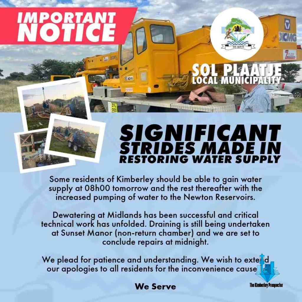 Anticipating positive outcomes, Mothibi informed residents that water supply restoration is expected to commence at 08:00 tomorrow for some areas of Kimberley. The intensified pumping of water to the Newton Reservoirs will facilitate this early relief, with the remaining areas set to follow suit. Successful dewatering at Midlands has enabled crucial technical work including welding, while ongoing drainage efforts at Sunset Manor (non-return chamber) are progressing towards completing repairs by midnight.