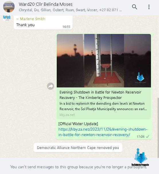 The Kimberley Prospector sought assistance from DA Councillor Marie Beyleveld, requesting access to ward groups to stay informed about DA Councilor Chris Whittaker’s notices. However, the situation took an unexpected turn when the media outlet was abruptly removed from the Ward 20 group after sharing an official update from the Sol Plaatje Municipality (SPM).