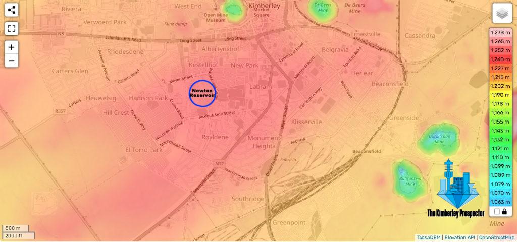 Explore the intricate landscape of Kimberley, Northern Cape, through this detailed topological map highlighting the Newton Reservoir and nearby neighbourhoods.